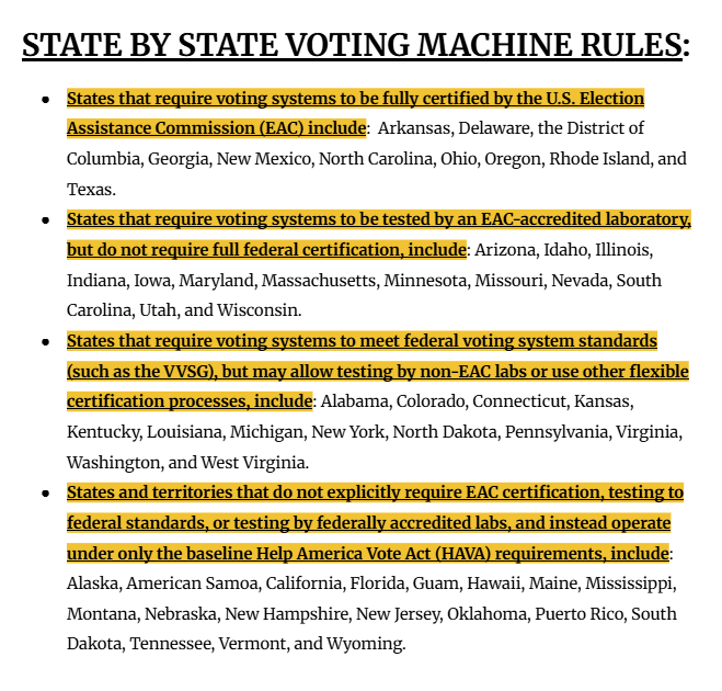 Even the Election Assistance Commission (EAC), the federal agency supposedly in charge of voting tech, admits it. Let that sink in: there is no mandatory federal standard for voting machines in the United States. None. It varies on a state-to-state basis.