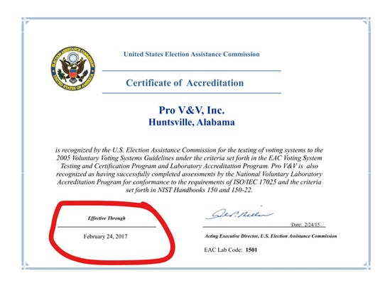 According to official EAC records, Pro V&V’s federal accreditation to certify our voting machines expired in February 2017.