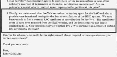 The rules Pro V&V was operating under at the time clearly required a dated, signed letter as part of the re-accreditation process. Without that, the lab’s certifications should have been invalid. Every machine approved during that time should have been pulled but they weren’t. I cannot see any other explanation than this letter was an attempt to cover up what they’d done, but this lawsuit made that difficult.
