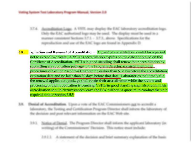 So, instead, the EAC suddenly retroactively changed the rules (but only after the scandal) issuing a 2021 “notice of clarification” claiming that accreditations for these actually don’t expire unless explicitly revoked. That interpretation directly contradicts the existing rules in place when Pro V&V’s accreditation lapsed.