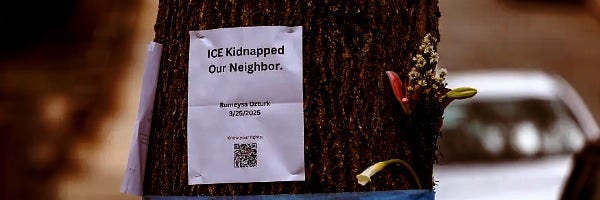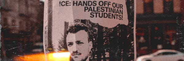 Mahmoud Khalil was locked in a Louisiana detention center for 104 days and forced to miss the birth of his son, Yunseo Chung nearly lost her residency for sitting on a library floor, and RĂŒmeysa ĂztĂŒrk was surrounded by masked men, thrown in a van and dragged off, denied her inhaler, and smeared as a terrorist sympathizer after her visa was revoked. None of them were violent. None were criminals. Their only âcrimeâ was speaking out. Using their first amendment rights.
