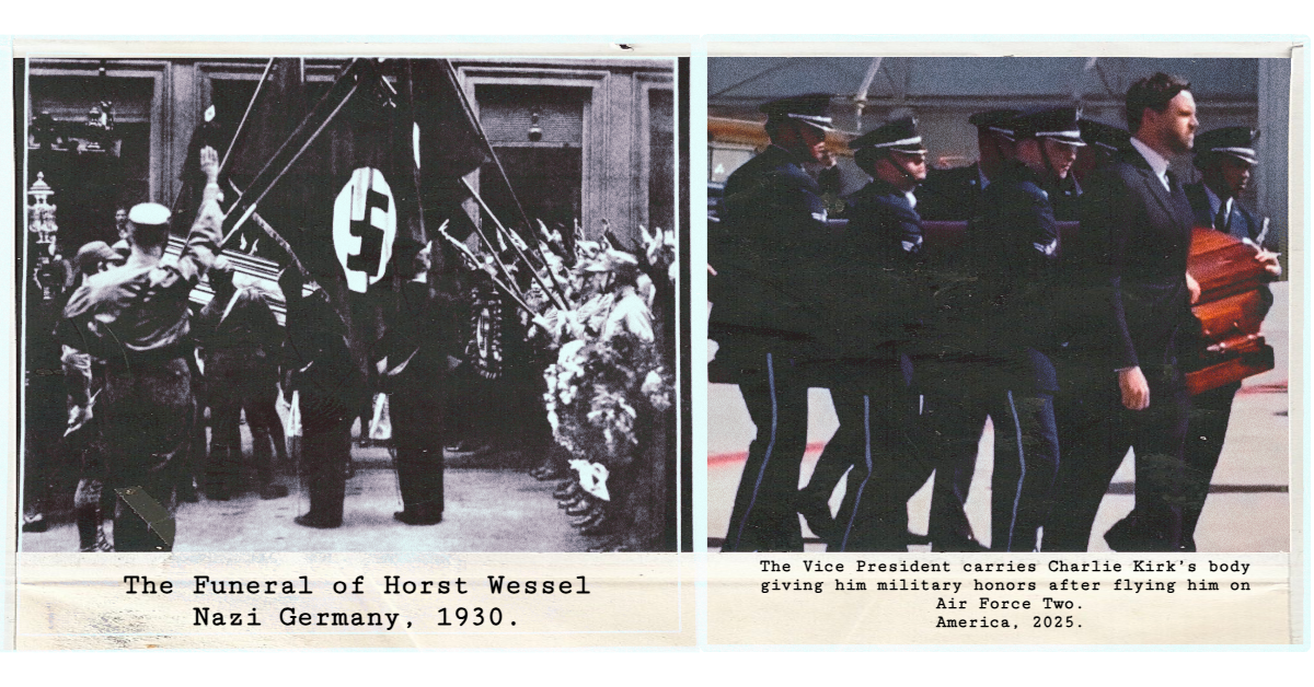 Charlie Kirk didnât die in a battlefield. He wasnât a soldier. He wasnât a victim of genocide. But the Trump administration is already turning him into a sacred symbol. He was a a political martyr, carefully sculpted and weaponized. Just like the Nazis did with Horst Wessel.